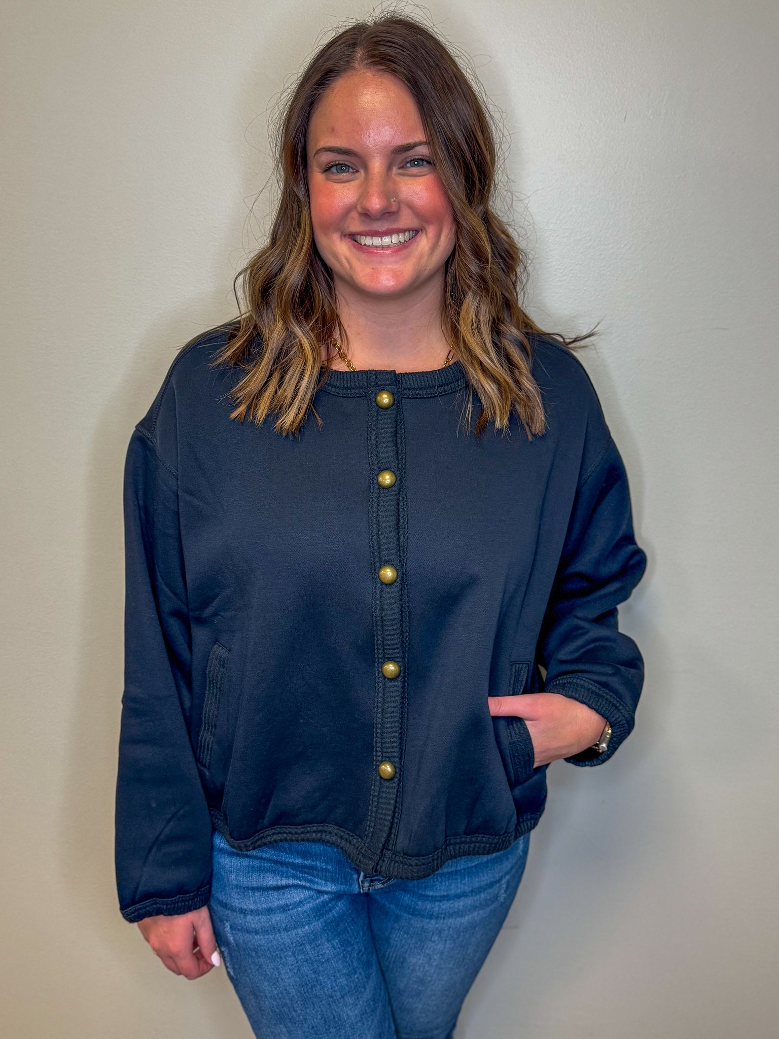 The Belle Bloom Cardigan combines vintage charm with modern comfort in a poly-cotton knit designed for layered styling. Its signature bubble hem creates a gently gathered silhouette, while bronze buttons and thermal contrast detailing at the pockets, cuffs, and neckband add nostalgic character. The warm, breathable fabric works seamlessly over dresses or paired casually with leggings, making it an essential piece for fall and winter transitions. Available in deep navy or rose taupe.