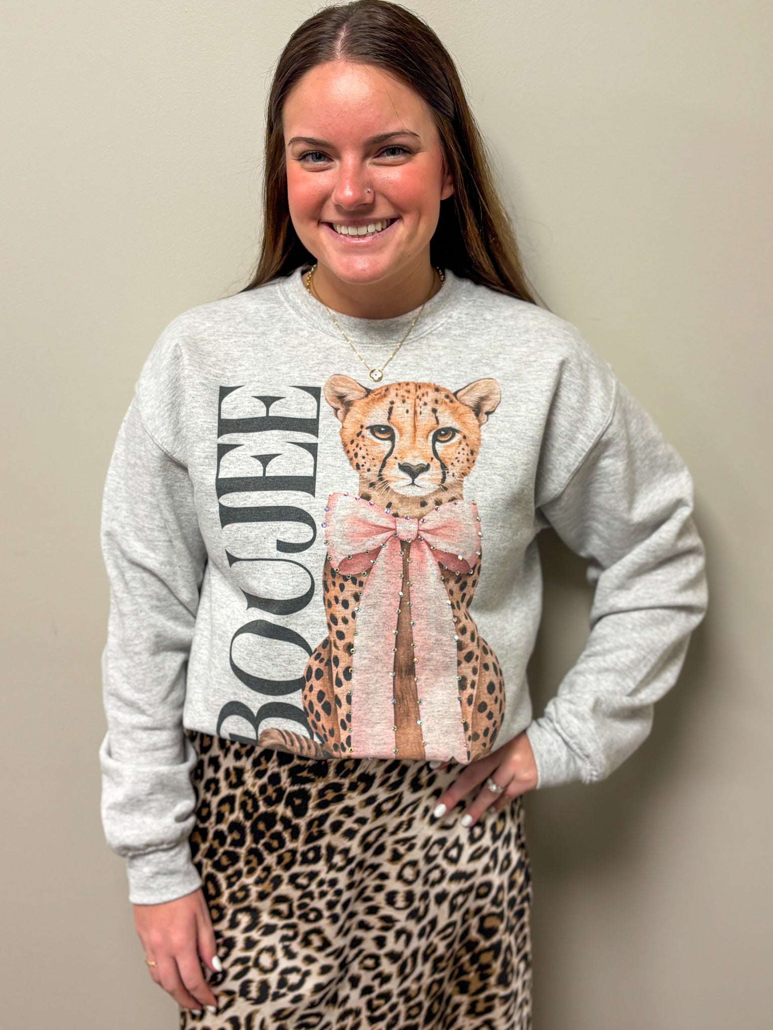 Elevate your casual wardrobe with this ash grey sweatshirt, thoughtfully designed for those who appreciate refined style with a playful edge. Featuring eye-catching cheetah embellishments that add instant personality, this piece strikes the perfect balance between sophisticated and fun. The soft, comfortable fabric makes it ideal for everyday wear, while the distinctive details ensure you'll stand out from the crowd. Perfect for layering or wearing solo, this sweatshirt brings an effortless boujee vibe to any outfit.