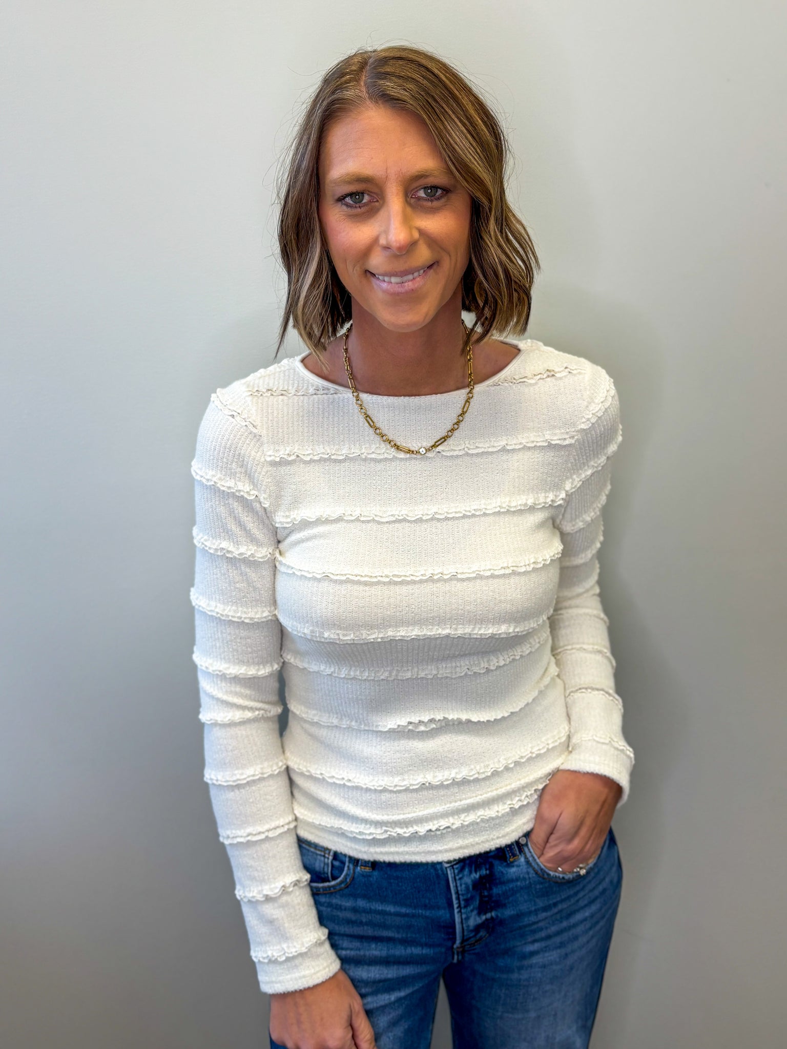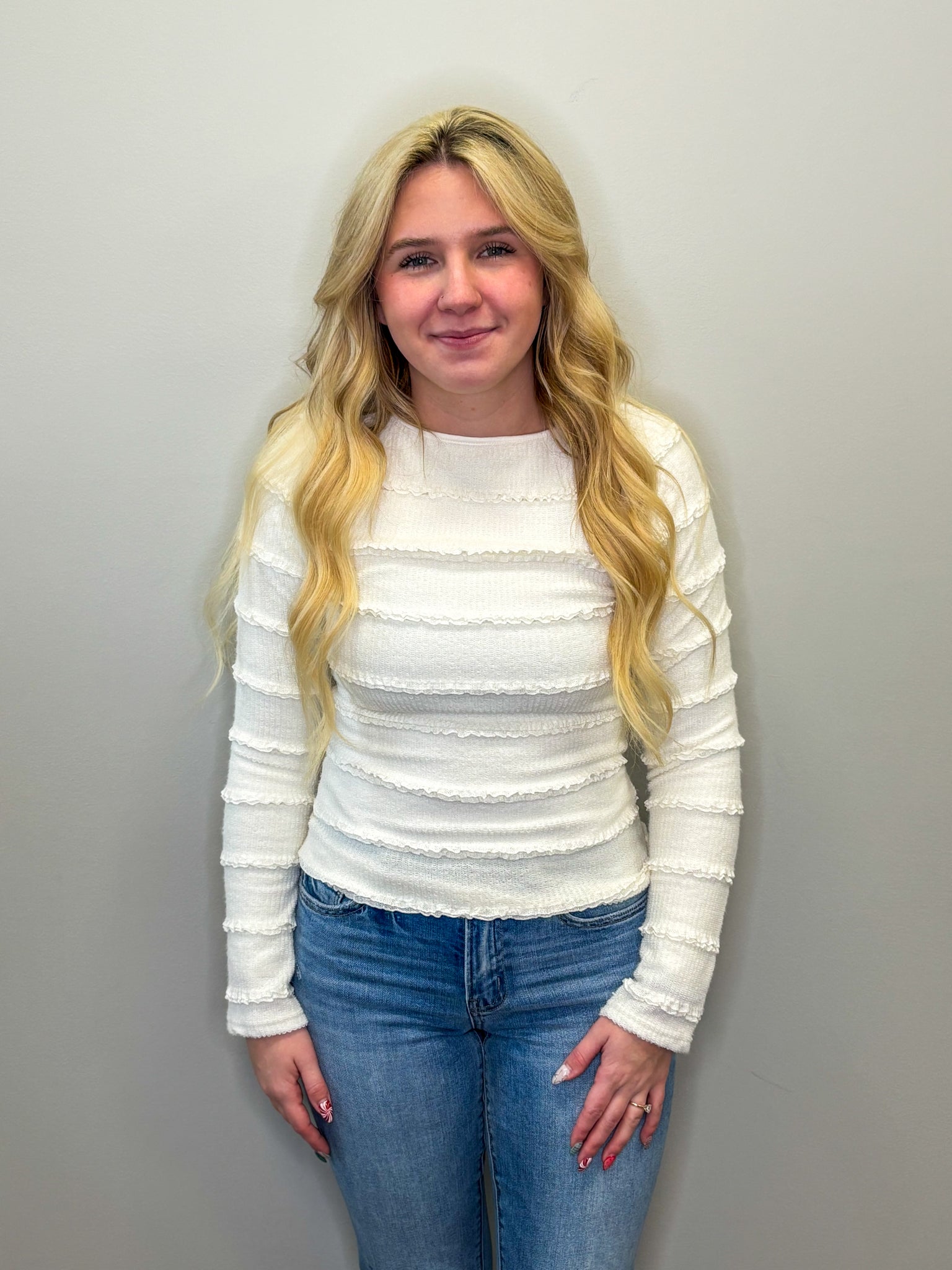 This Brushed Lace Top features a sophisticated boat neckline and elegant long bell sleeves, crafted from a high-quality blend of 90% cotton and 10% spandex. The fabric offers a soft, breathable feel with just the right amount of stretch for comfort and ease of movement. Ideal for layering or wearing alone, this top combines timeless lace detailing with modern fit, perfect for elevating both casual and dressy ensembles.