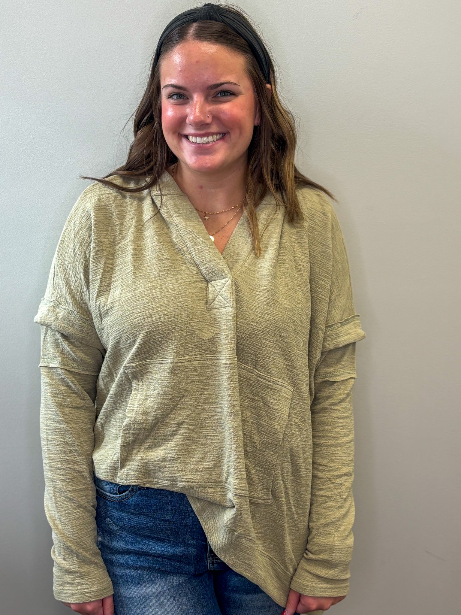 The Day to Day Hoodie combines comfort and style with its lightweight, textured knit fabric made from 45% cotton, 53% polyester, and 2% spandex. Featuring a relaxed, loose fit with a sharkbite hem and raw cut seams, it offers a modern, effortless look. Layered sleeve detailing and a kangaroo pocket add functional design elements. Available in khaki or sage, this hoodie measures 25" in length, 27" bust, and 18" sleeve for a small size. Perfect for everyday wear, it balances casual ease with thoughtful construction. Please verify availability before ordering.
