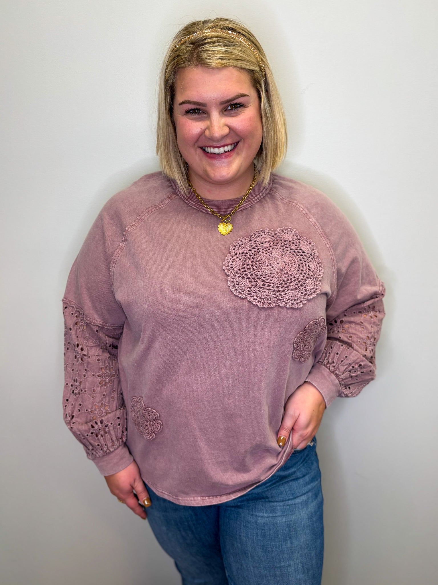 This Eyelet Lace Top features a relaxed, loose fit with a round neckline accented by raw edge detailing for a subtle, unfinished look. Crafted from mineral-washed terry fabric, it offers a soft, worn-in feel. Decorative floral crochet doilies combined with intricate eyelet lace design add a delicate, artisanal touch, making it a refined choice for effortless style and comfort.