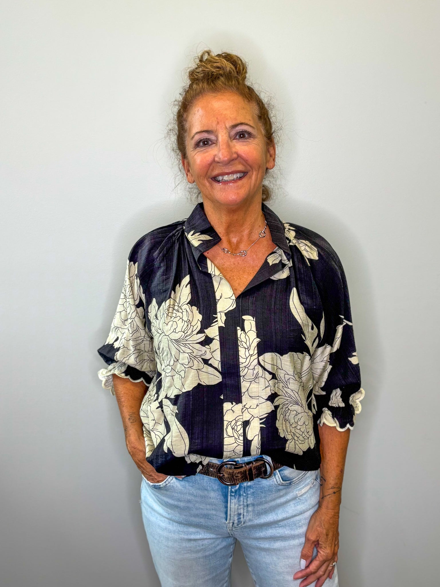 Elevate your wardrobe with the Floral Scalloped Trim Blouse, designed for a relaxed, boxy fit that ensures comfort and style. Its split neckline and half puff sleeves add subtle sophistication, while the high-low hemline creates a flattering silhouette. Crafted from a lightweight blend of 90% rayon and 10% nylon, this blouse offers breathable wear without lining, making it perfect for layering or warm-weather days. Modeled for a tailored yet easygoing look, it balances trendy details with timeless ease.