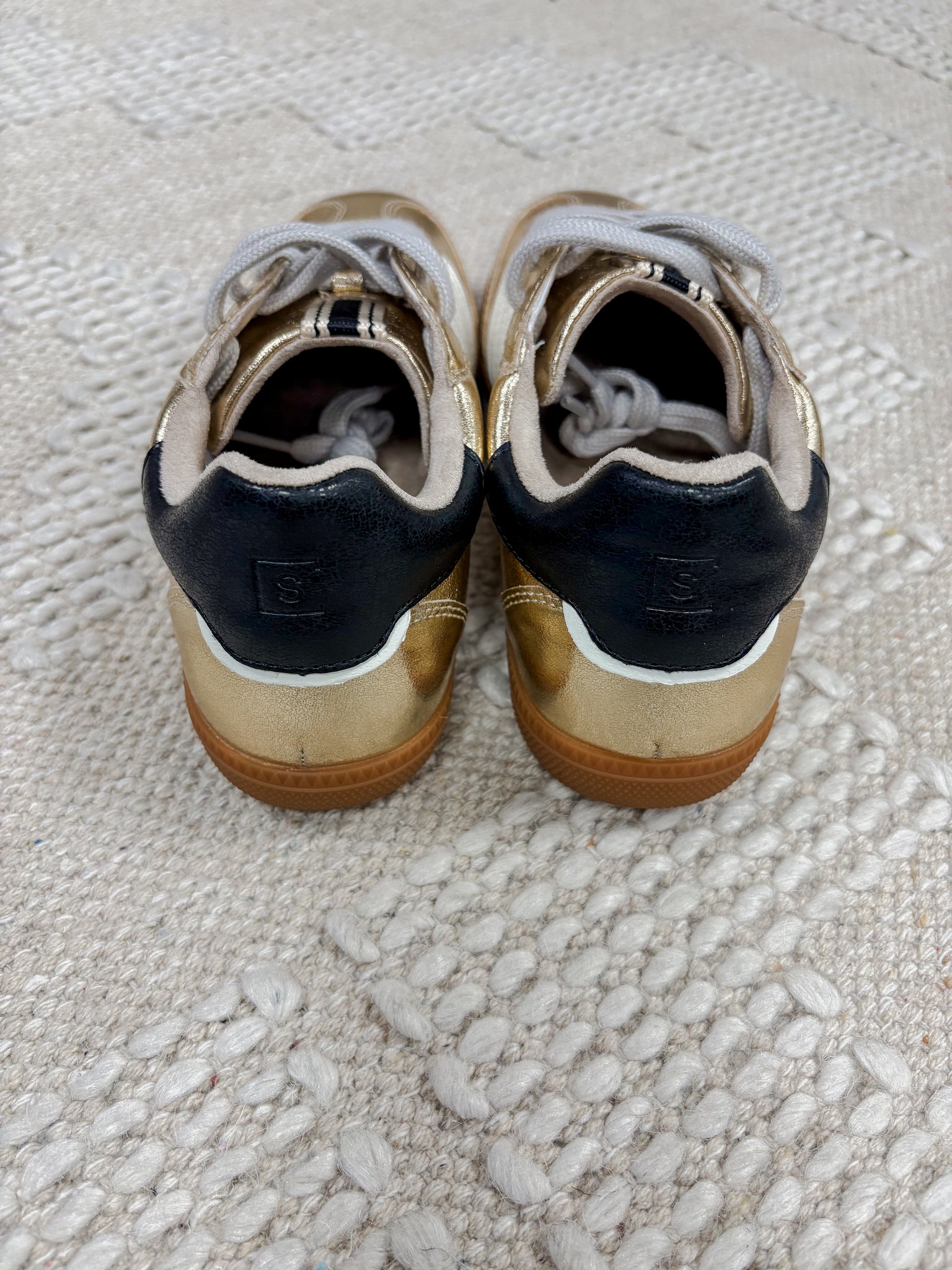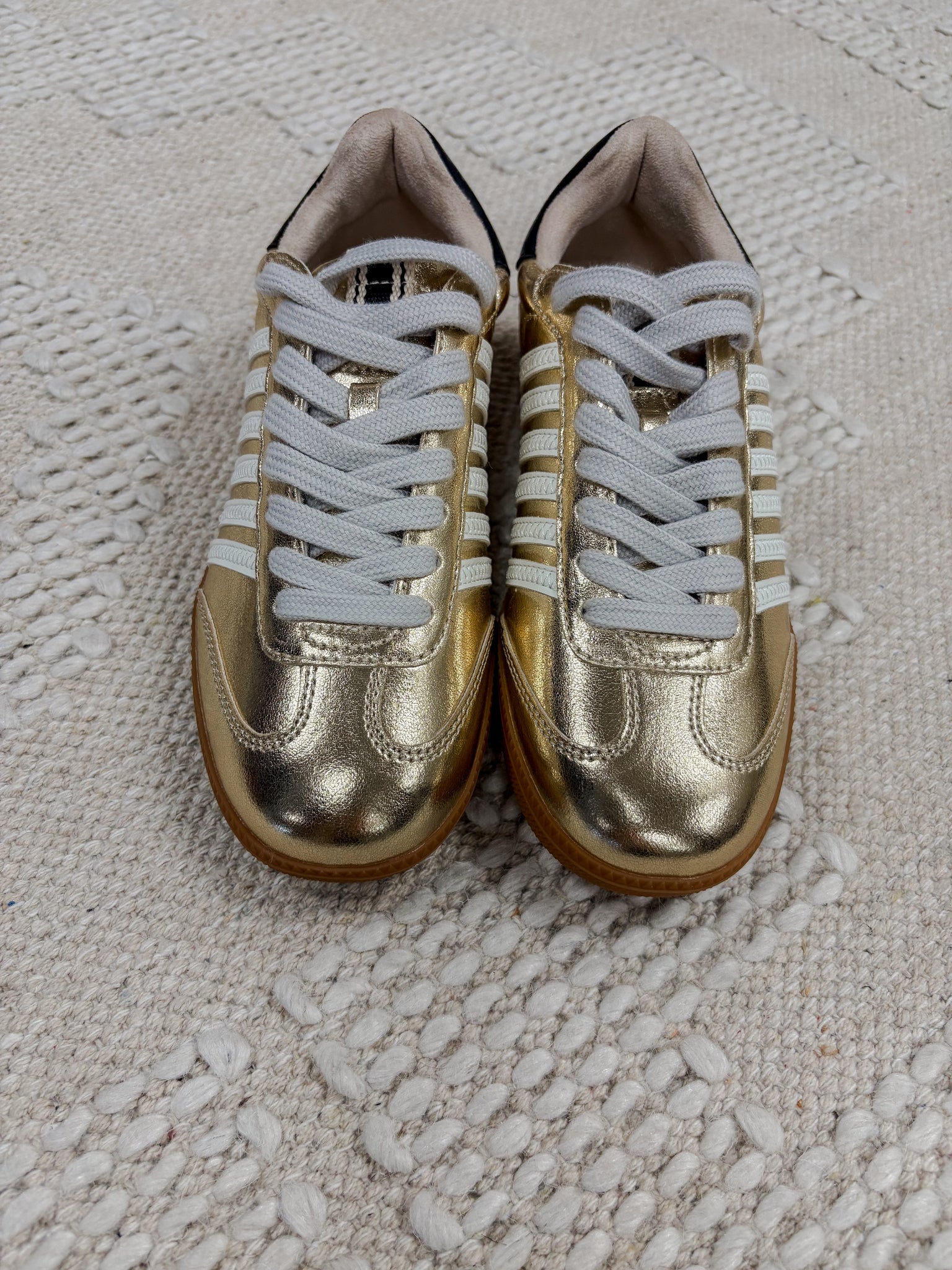 Let your sneakers command attention with the STEVIE LIGHT GOLD—a sophisticated blend of retro charm and contemporary glamour. Crafted from lustrous faux metallic leather in light gold with crisp white accents, this lace-up sneaker features a soft padded lining for all-day comfort and a classic gum rubber sole that grounds its bold aesthetic. The light-catching finish elevates any casual ensemble, from tailored denim to minimalist separates, delivering understated luxury with every step.