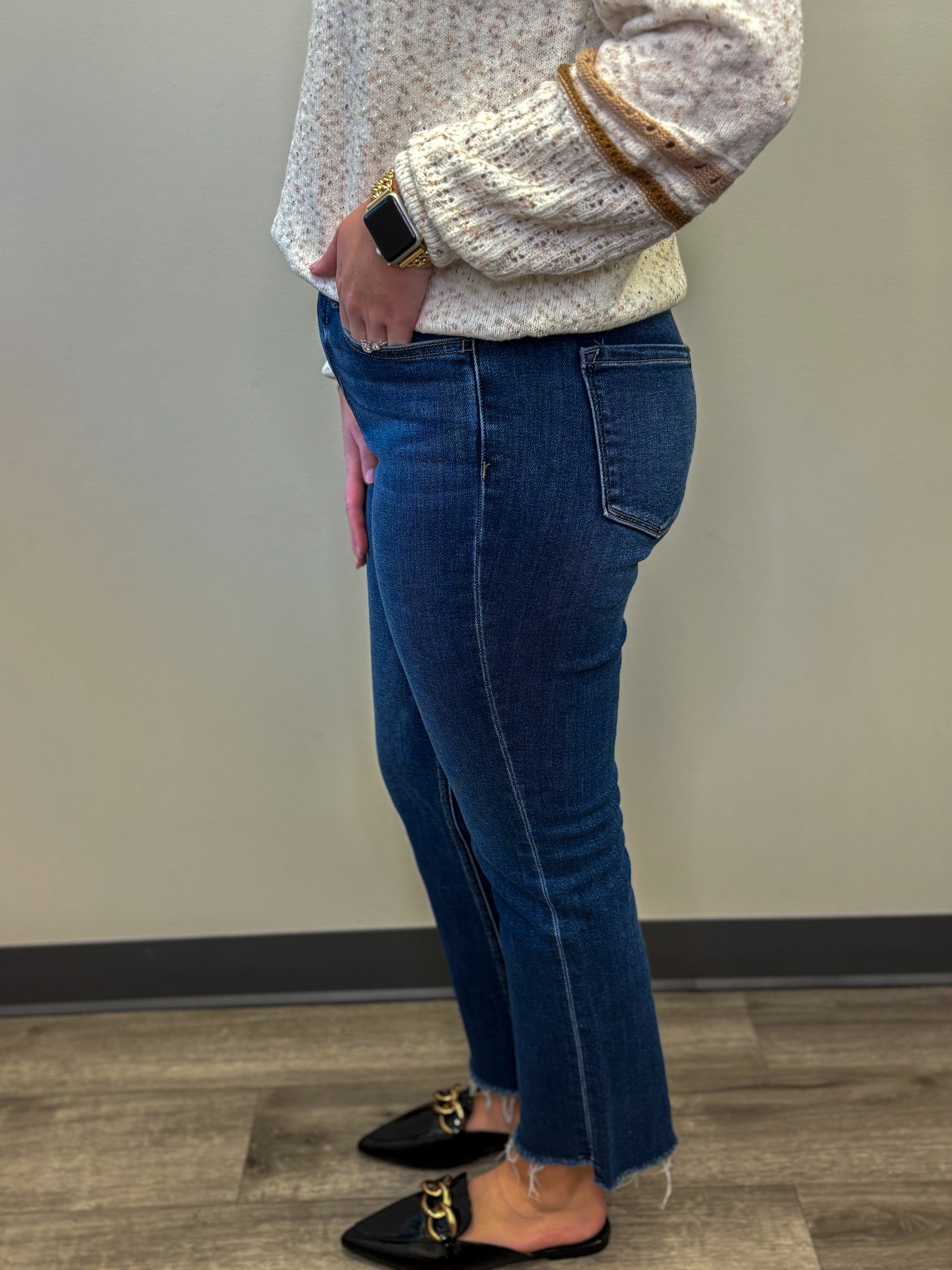 Elevate your denim collection with these high-rise kick flare jeans, expertly crafted for a flattering silhouette. The 10" rise sits perfectly at the waist, while the cropped 27" inseam pairs beautifully with the 16" flared leg opening for a modern, statement-making look. Constructed from a premium comfort stretch blend—65% cotton, 30% polyester, 3% rayon, and 2% spandex—these jeans offer all-day wearability without sacrificing style. The raw step hem adds an intentional, fashion-forward edge, while the classic five-pocket design ensures timeless functionality. Available in a rich dark wash that transitions seamlessly from day to night.