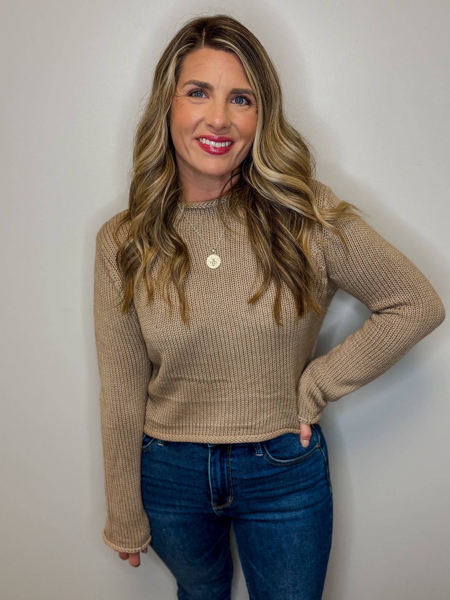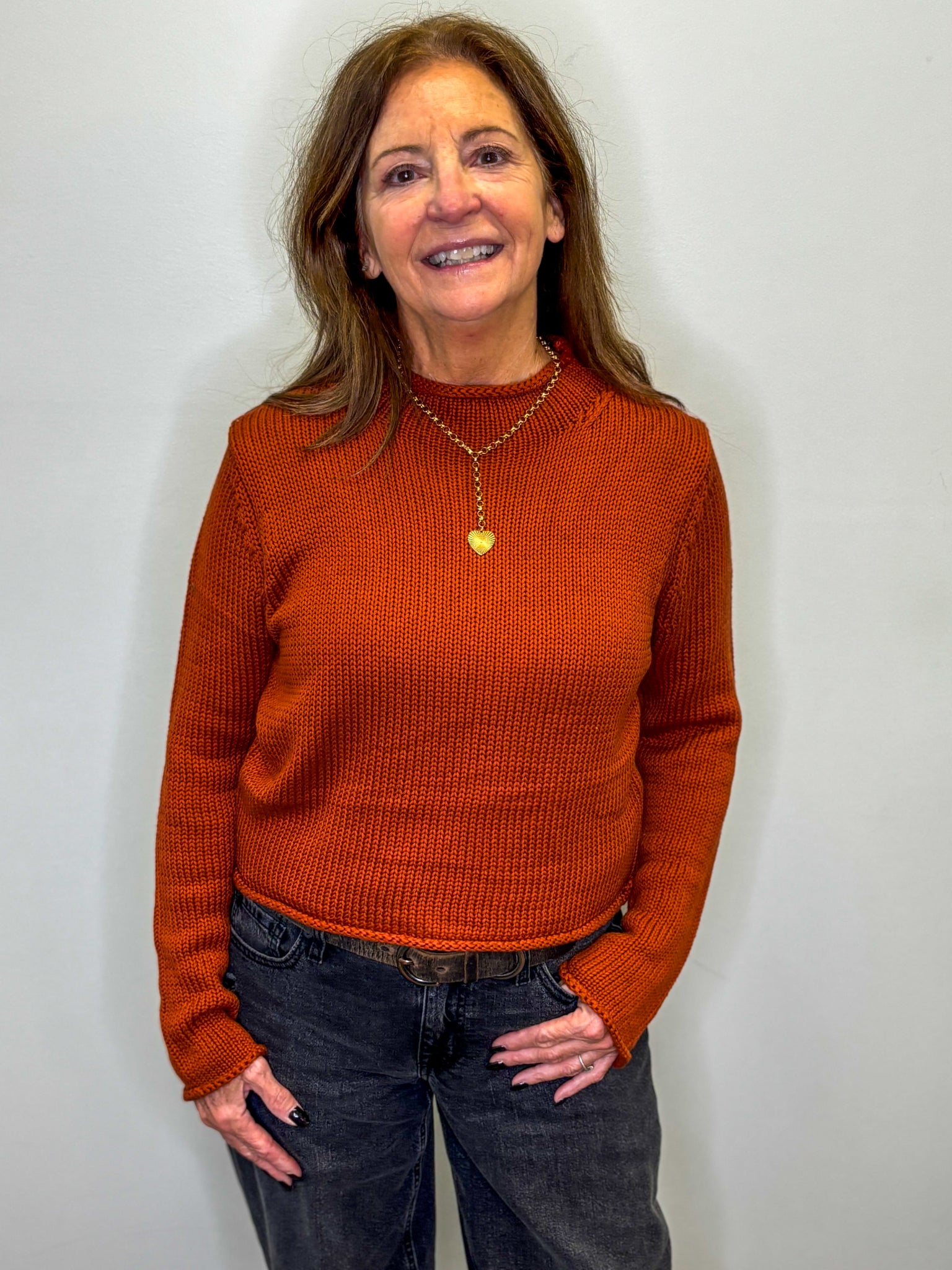 This lightweight fall sweater combines comfort and style with its medium-weight knit fabric made from 55% acrylic and 45% cotton. Designed with a waist-length cut and long sleeves, it features a rolled edge finish around the round neckline for a refined look. Available in rust or taupe, this solid pullover offers a non-sheer, unlined construction ideal for layering during cooler seasons.