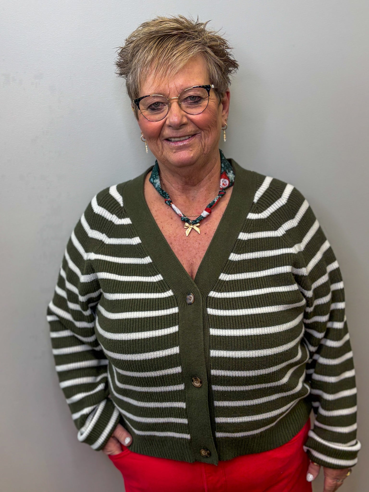 This long sleeve striped cardigan offers a relaxed fit and button-down front for effortless layering. Crafted from a lightweight knit blend of 75% acrylic and 25% nylon, it ensures breathable comfort and durability. The olive tone adds a subtle, versatile touch to your wardrobe, while its extended sleeves provide added coverage and warmth. Ideal for transitional weather, this cardigan pairs well with both casual and polished outfits, offering both style and function.