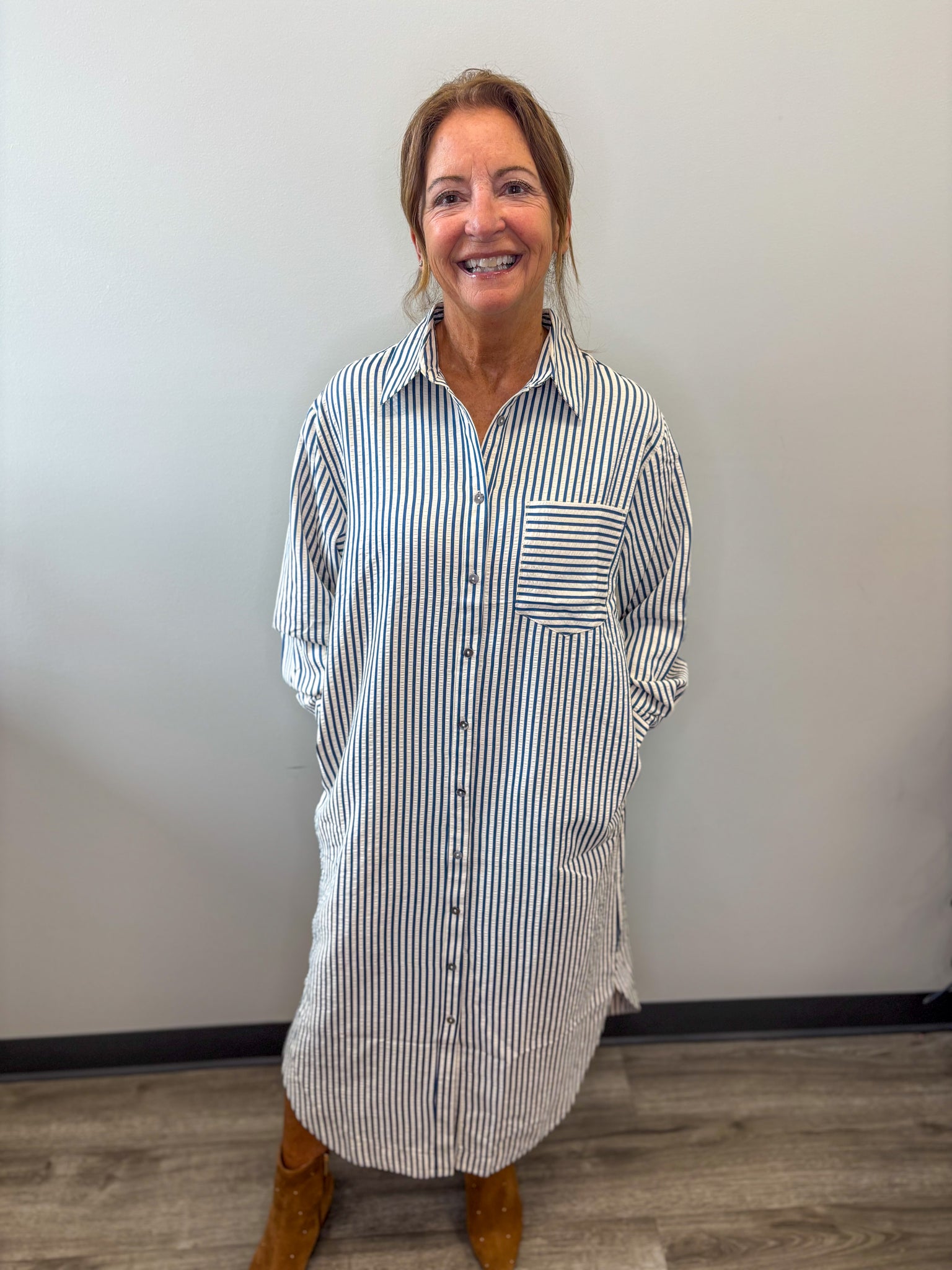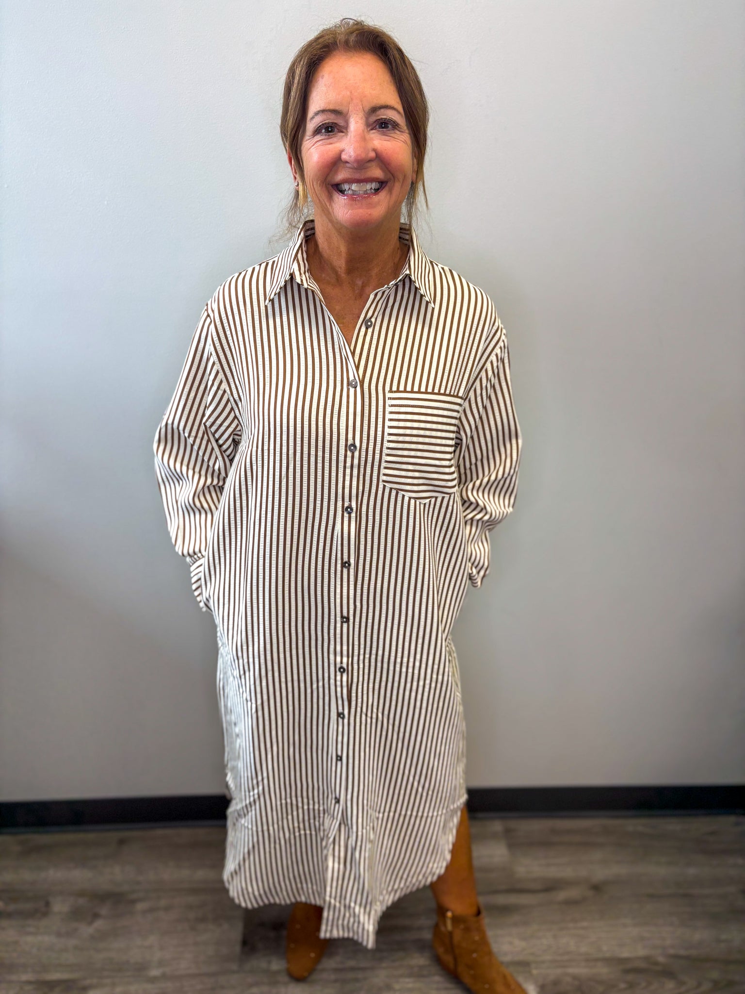 This midi shirt dress features a textured stripe pattern and a rounded slit hem for a modern silhouette. Crafted from lightweight, woven 100% polyester, it offers a non-sheer, breathable feel. Practical side pockets add convenience, while the unlined design ensures comfort and ease of movement. Ideal for versatile styling across seasons.