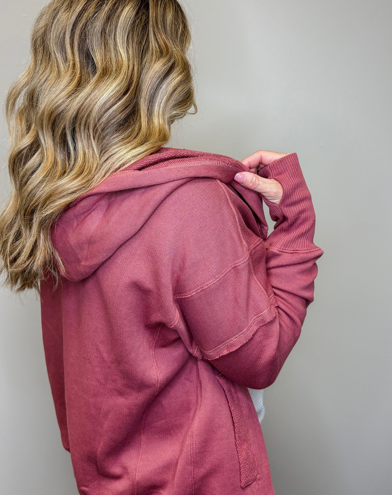 This oversized hoodie jacket combines comfort and functionality with its soft 60% cotton and 40% polyester blend. Designed with a snap-button front, long sleeves, and convenient side pockets, it offers practicality without sacrificing style. Available in dark green or marsala, this versatile piece provides warmth and a relaxed fit, ideal for layering through cooler seasons.