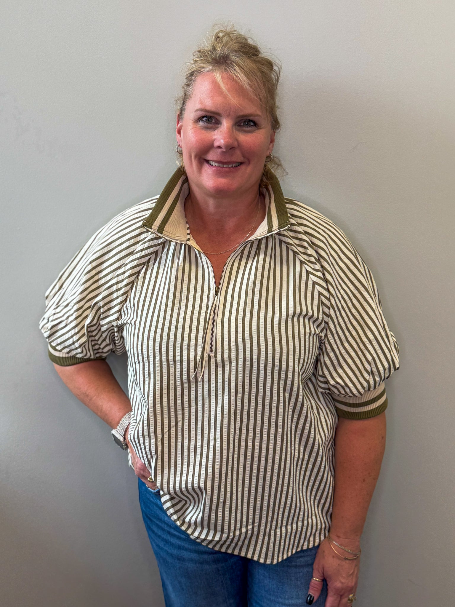 This Pin Stripe Zip Top combines a sophisticated stripe pattern with a practical half-zip closure for easy wear. Featuring short puff sleeves and a multicolor accent band, it offers a stylish, lightweight option for warm weather. Crafted from a woven blend of 50% cotton and 50% polyester, the unlined fabric ensures comfort without sheerness. Available in olive, this top balances casual elegance with expert design details.