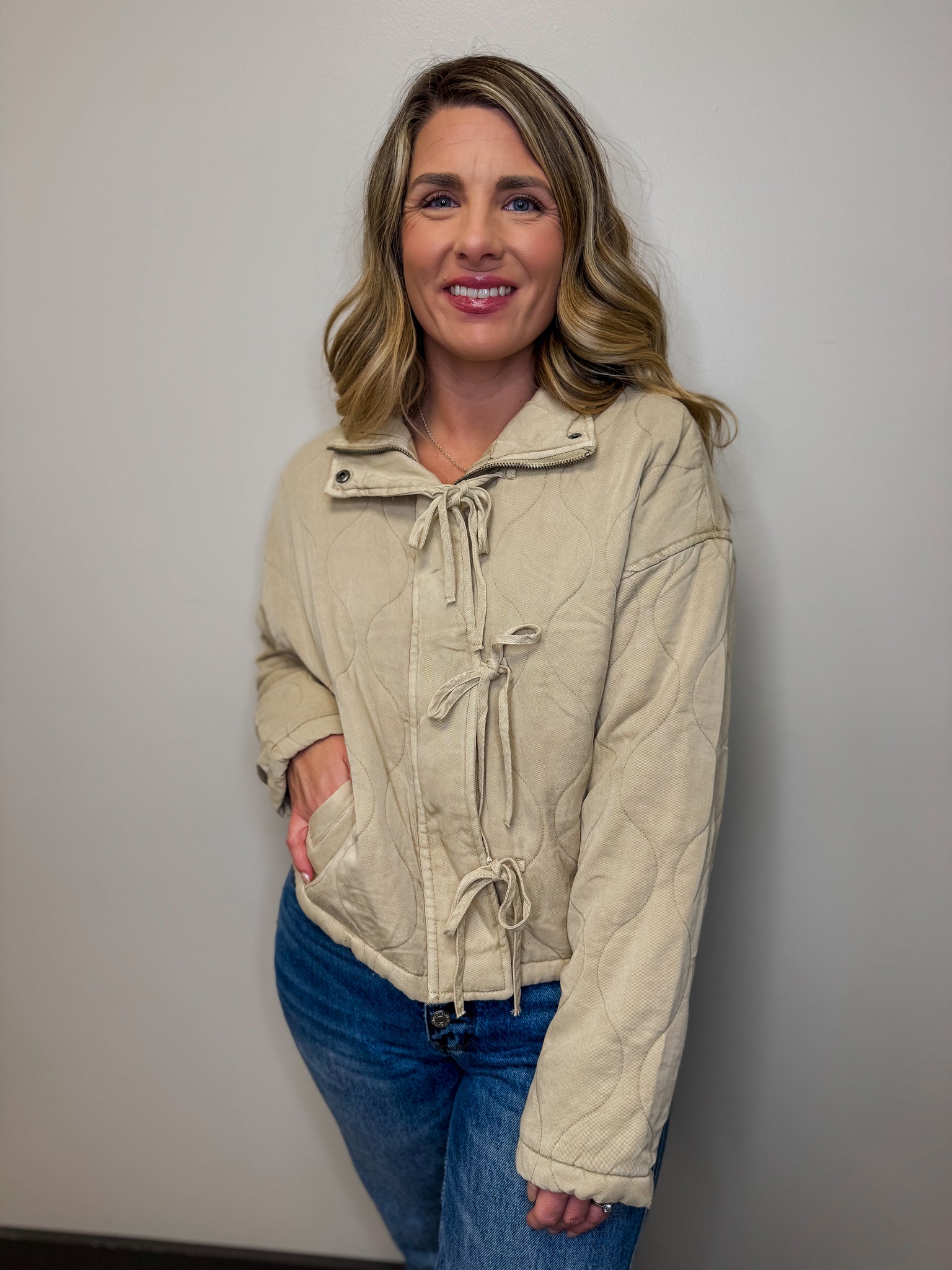 Elevate your layering game with this light khaki quilted tie jacket, expertly crafted with a washed finish for an effortlessly refined aesthetic. The quilted front design provides structured warmth, while the tie closure allows for customizable fit and styling versatility. Perfect for transitional seasons, this piece seamlessly transitions from casual outings to polished weekend looks. The soft, washed texture adds depth and character, ensuring this jacket becomes a reliable staple in your wardrobe.