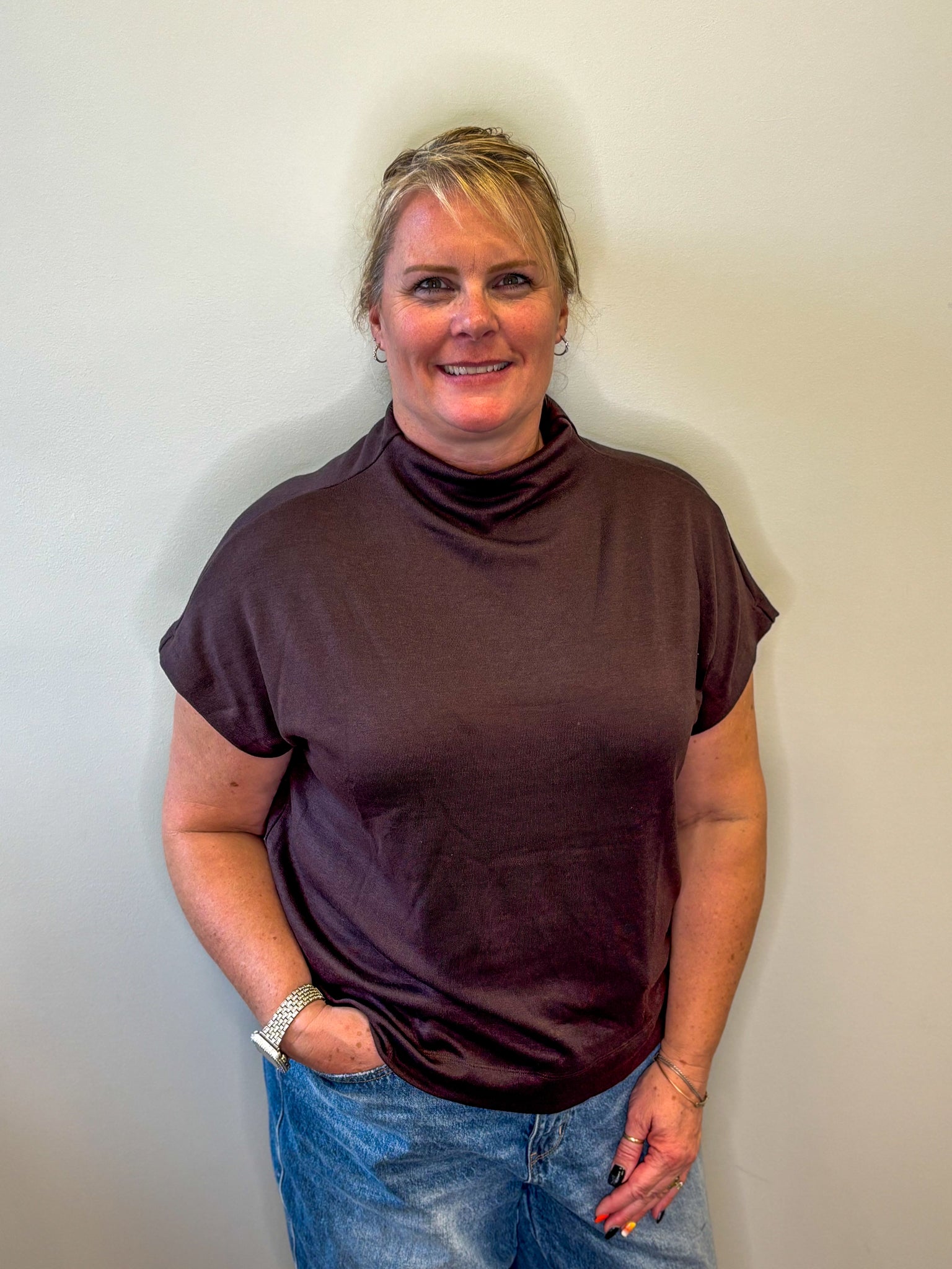 This solid knit mock neck pullover offers a lightweight, non-sheer design crafted from a blend of polyester, viscose, and spandex for comfortable stretch and durability. Its unlined construction ensures breathability, making it ideal for layering or wearing alone. Available in brown or oatmeal, it pairs seamlessly with coordinating pants for a polished, versatile look.