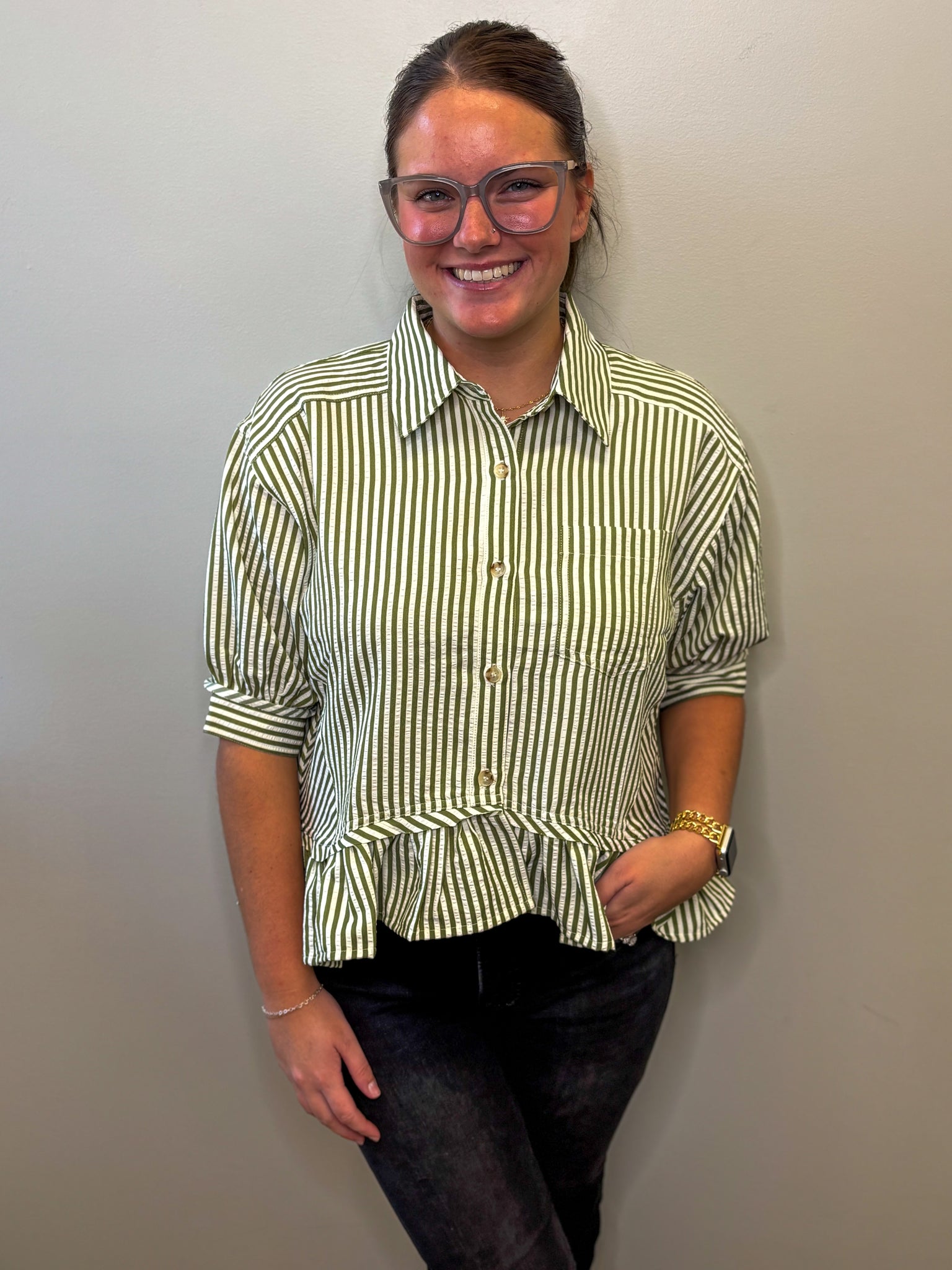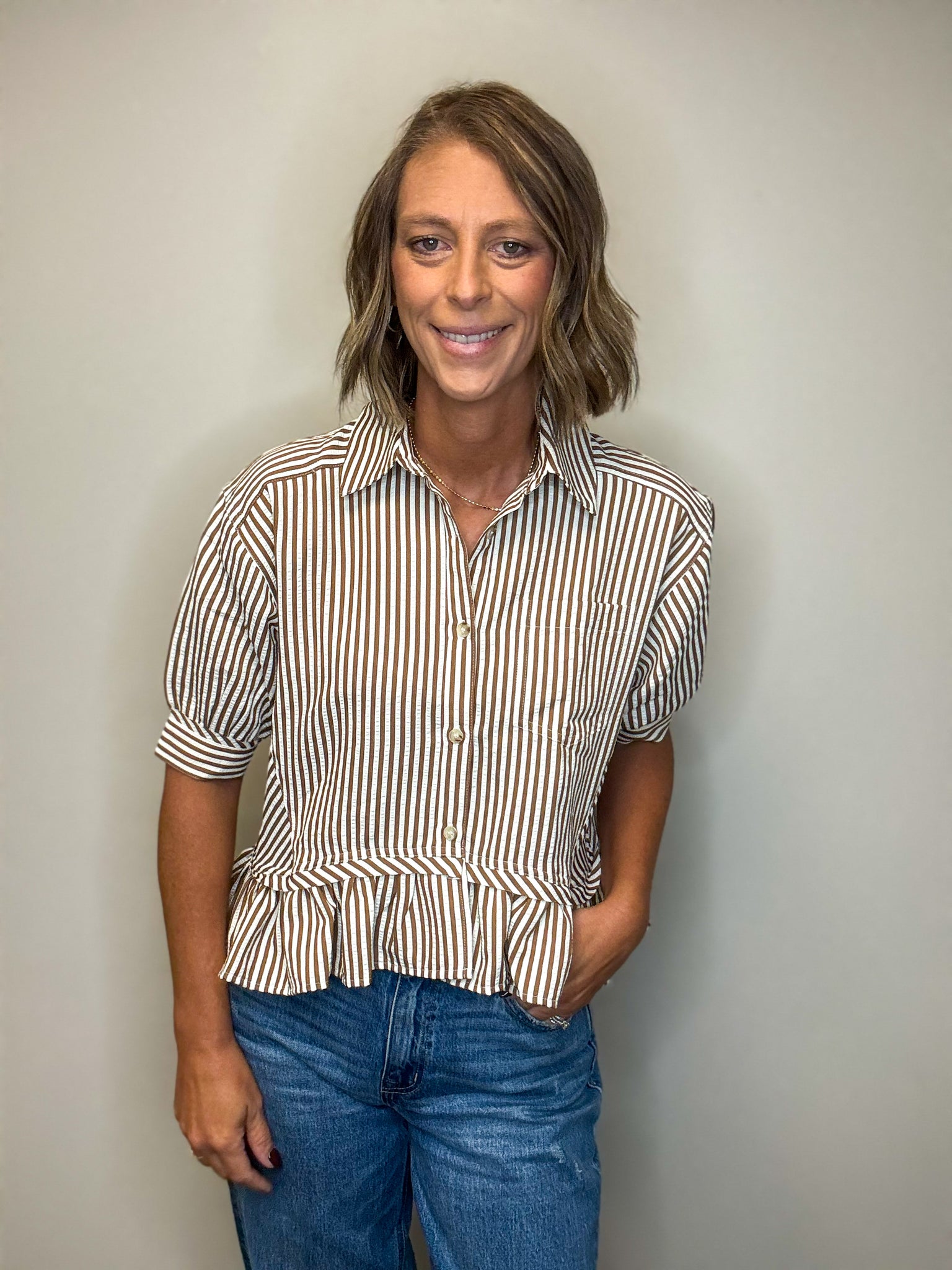 This lightweight woven top features a sophisticated stripe pattern with a cuff band and ¾ sleeves, finished with a delicate ruffle hem for added elegance. The button-front closure offers easy wear, while the unlined, non-sheer fabric ensures comfort and breathability. Crafted from a blend of 50% polyester, 49% rayon, and 1% spandex, it provides a subtle stretch for a flattering fit. Available in versatile Olive and Brown shades, it pairs perfectly with Pants for a polished, professional look.