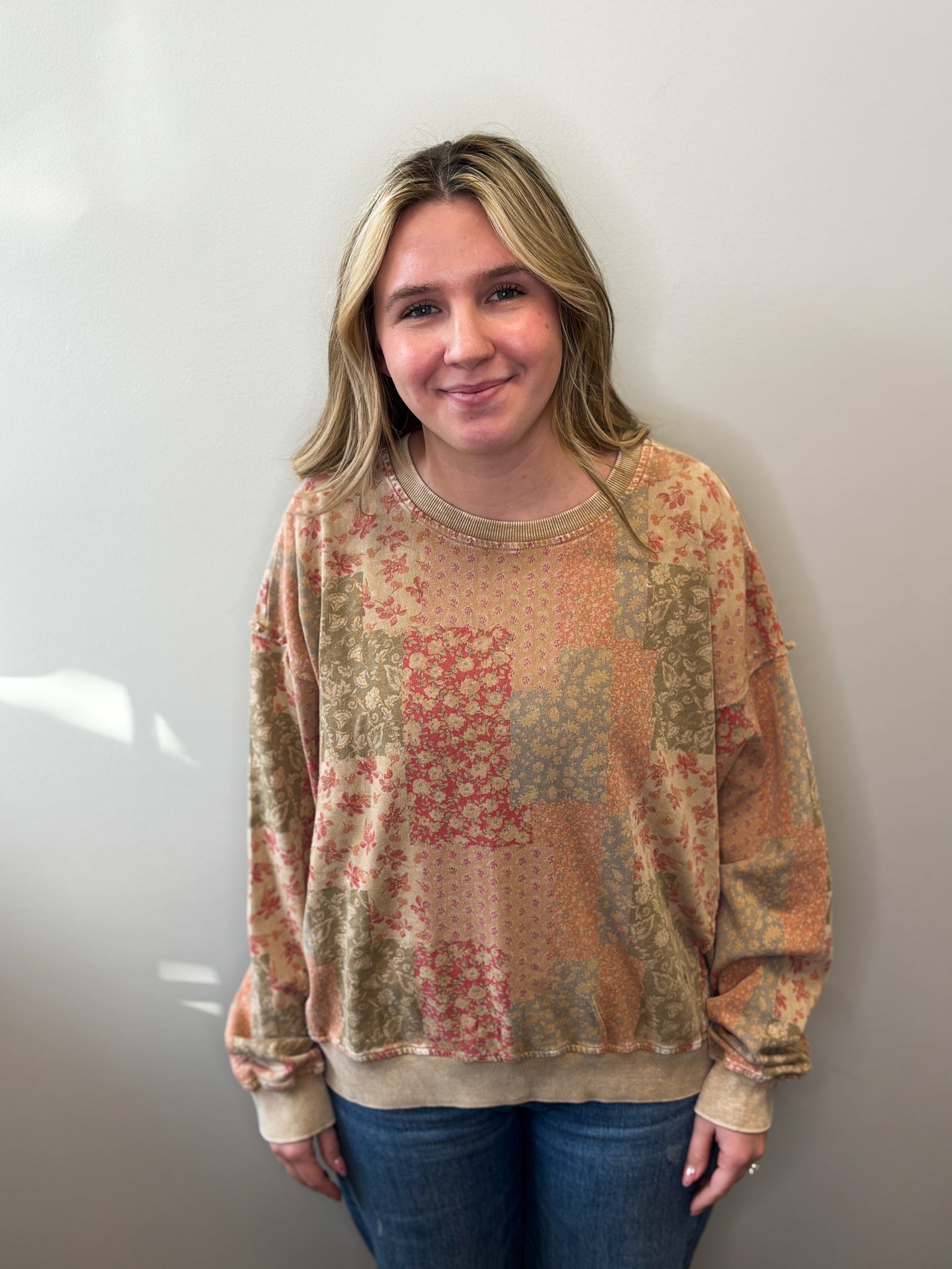 Embrace effortless style with this thermal floral pullover, designed for modern comfort. The relaxed, oversized silhouette features dropped shoulders and textured waffle knit fabric that adds visual interest and warmth. An all-over ditsy floral print brings a charming, feminine touch, while exposed seams and convenient side slits enhance its contemporary aesthetic. The crew neckline completes this versatile piece—perfect for layering or wearing solo during cooler seasons.