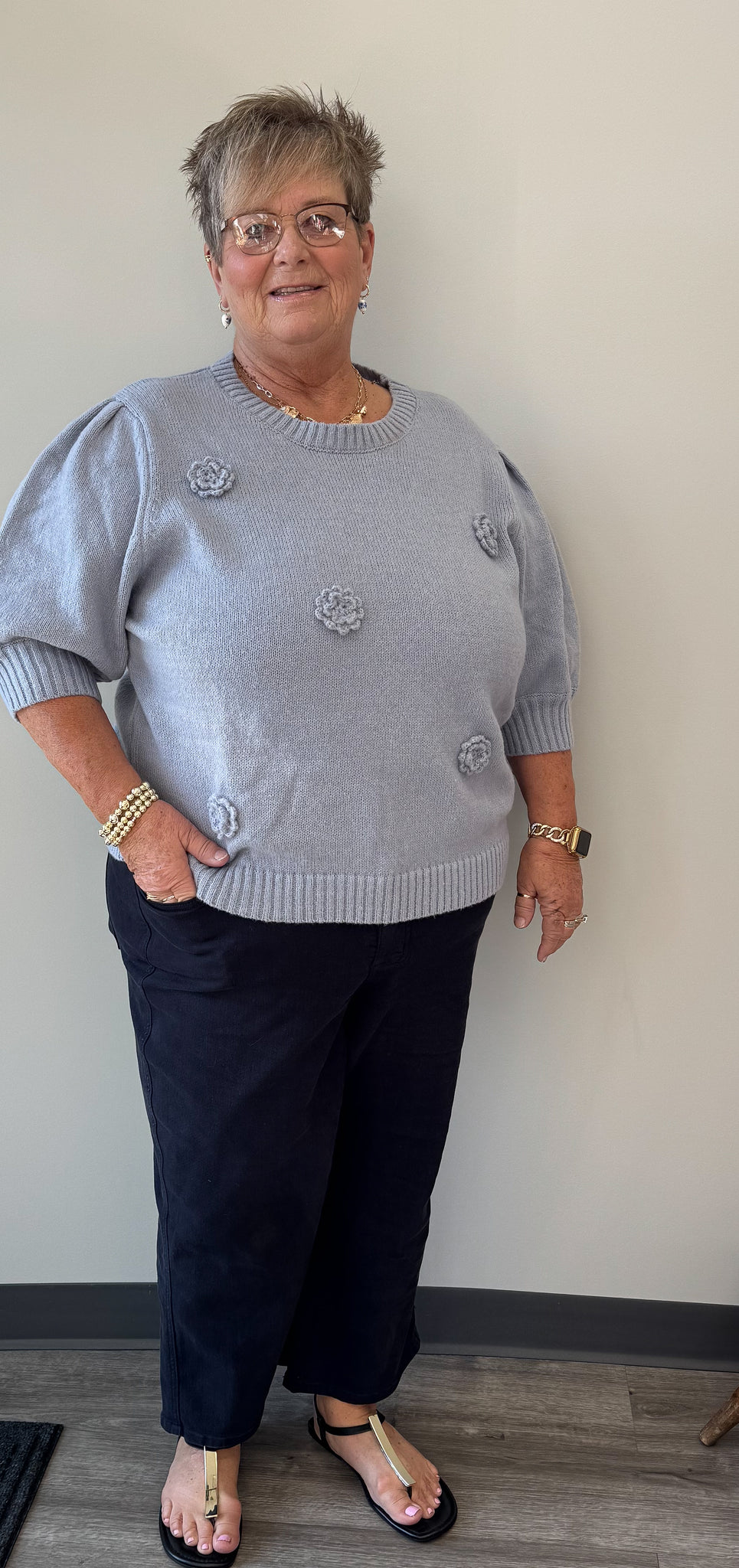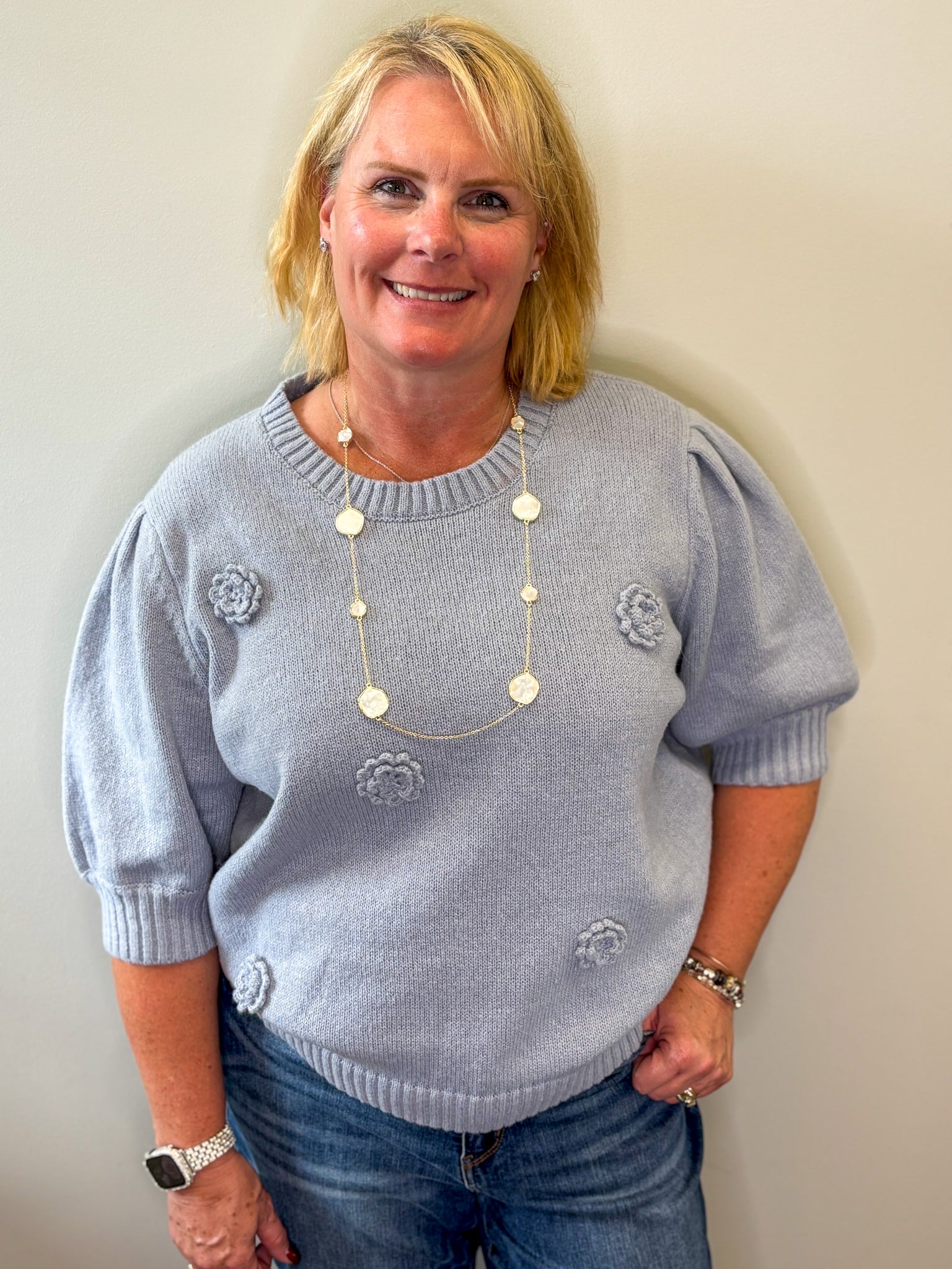 Expertly designed with a charming 3D flower print, our What you Want Knit Top is the perfect addition to your wardrobe. With its short sleeves and dusty blue color, this sweater top exudes elegance and versatility. Elevate your style with our top-quality knit and make a statement wherever you go.